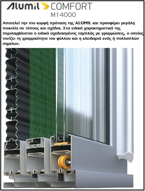 Το M14000 αποτελεί την πιο κομψή πρόταση της ALUMIL και προσφέρει μεγάλη ποικιλία σε τύπους και σχέδια. Στα ειδικά χαρακτηριστικά της περιλαμβάνεται ο ειδικά σχεδιασμένος ταμπλάς με γραμμώσεις, ο οποίος τονίζει τη γραμμικότητα του φύλλου και η κλειδαριά ενός ή πολλαπλών σημείων